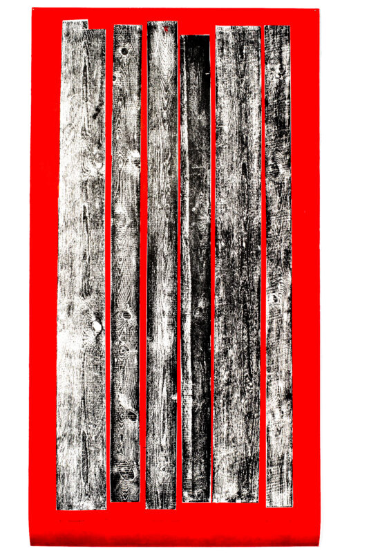 Praca oparta jest na zestawieniu surowych desek z wyraźnym rysunkiem struktury, tworzących częściowo przepuszczalną przegrodę, za którą wyłania się intensywna, symboliczna czerwień. Kolor działa jako siła napierająca, utrudniająca przekroczenie granicy i budująca napięcie pomiędzy otwartością a ochroną.