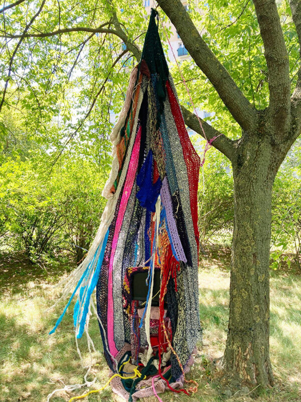 Obiekt z włóczki, kabli, wideo wyświetlane na ekranie monitora; finisażowi towarzyszyło wspólne szydełkowanie i powiększanie obiektu.