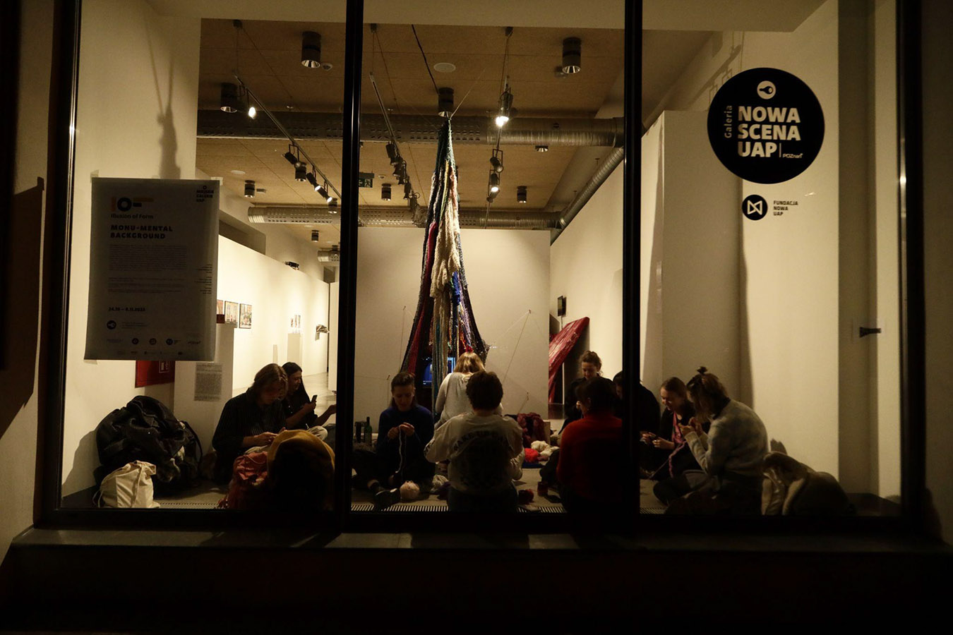 Obiekt z włóczki, kabli, wideo wyświetlane na ekranie monitora; finisażowi towarzyszyło wspólne szydełkowanie i powiększanie obiektu.