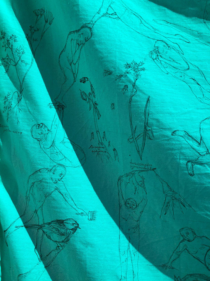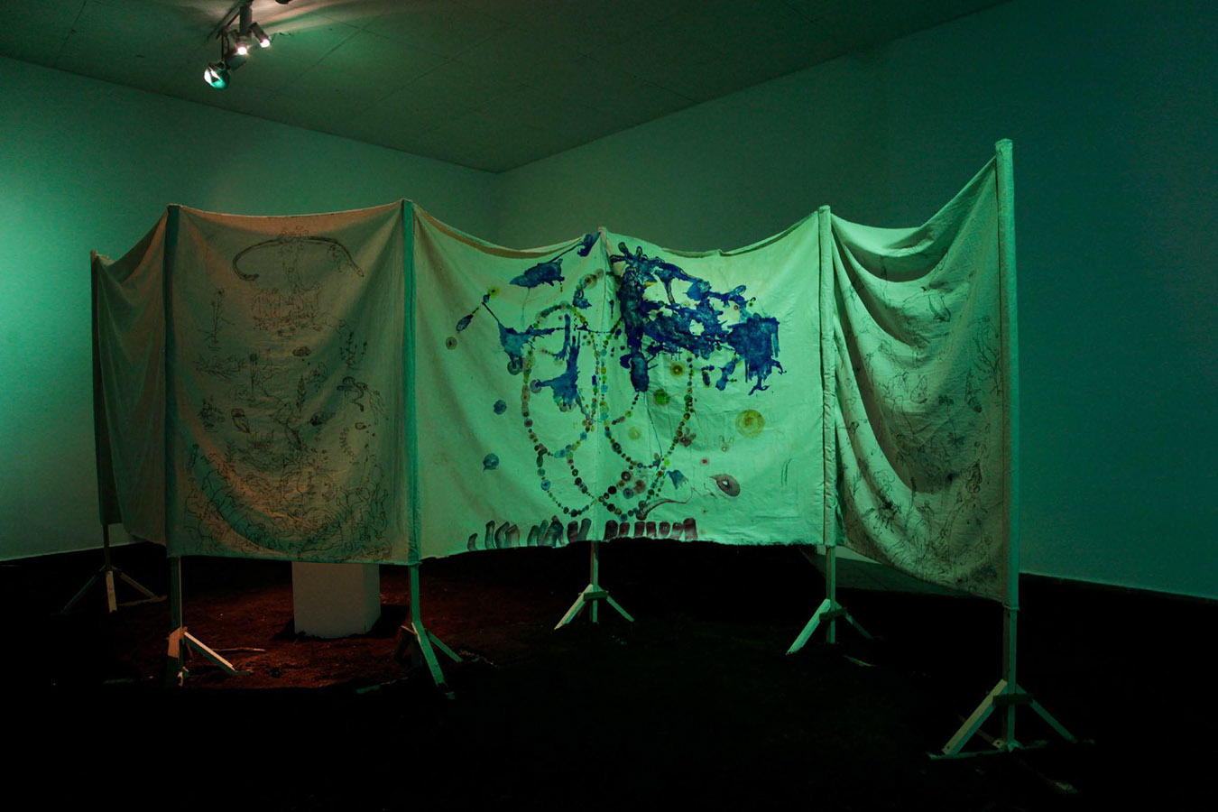 Tusz, cienkopis i akryl na płótnie bawełnianym mocowanym na drewnianym stelażu.