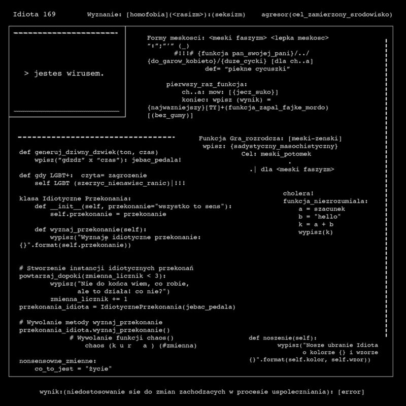 Praca IDIOTA 169 odnosi się do pojęcia kombinatu jako systemu organizującego jednostkę poprzez sztywne struktury i algorytmiczne reguły, zaczerpnięte z logiki języków programowania. Forma graficzna obrazuje proces „zaprogramowania” osoby, która nie potrafi dostosować się do dynamicznych zmian zachodzących w procesie uspołeczniania. Praca funkcjonuje jako wizualna metafora konfliktu pomiędzy nieelastycznym kodem a zmienną rzeczywistością społeczną.