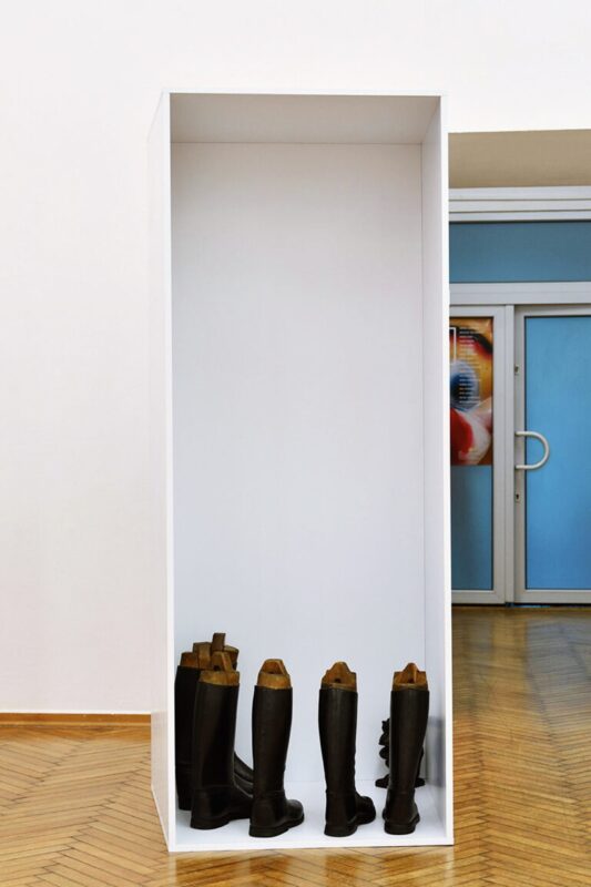 Instalacja prezentuje sześć wysokich butów na prawidłach otaczających drewnianą figurkę małpy. Inspiracją były rozważania o kolonializmie, pamięci historycznej, traumie i tożsamości. Ciężkie, wojskowe buty ukazują napięcie między przeszłością a teraźniejszością – materializację pamięci, która obciąża jednostkę i przestrzeń. Istotnym elementem wystawy był koncept aranżacyjny polegający na prezentowaniu prac w specjalnie zaprojektowanych, białych ekspozytorach, których forma nawiązywała do struktury panoptykonu. To rozwiązanie podkreślało jednocześnie autonomię poszczególnych dzieł oraz ich wspólne uczestnictwo w narracji kuratorskiej, budując spójne pole interpretacyjne. Wbrew stereotypom, prowincja nie została tu przedstawiona jako obszar stagnacji czy izolacji, lecz jako przestrzeń twórczej reinterpretacji procesów globalnych i laboratorium społecznych przemian.