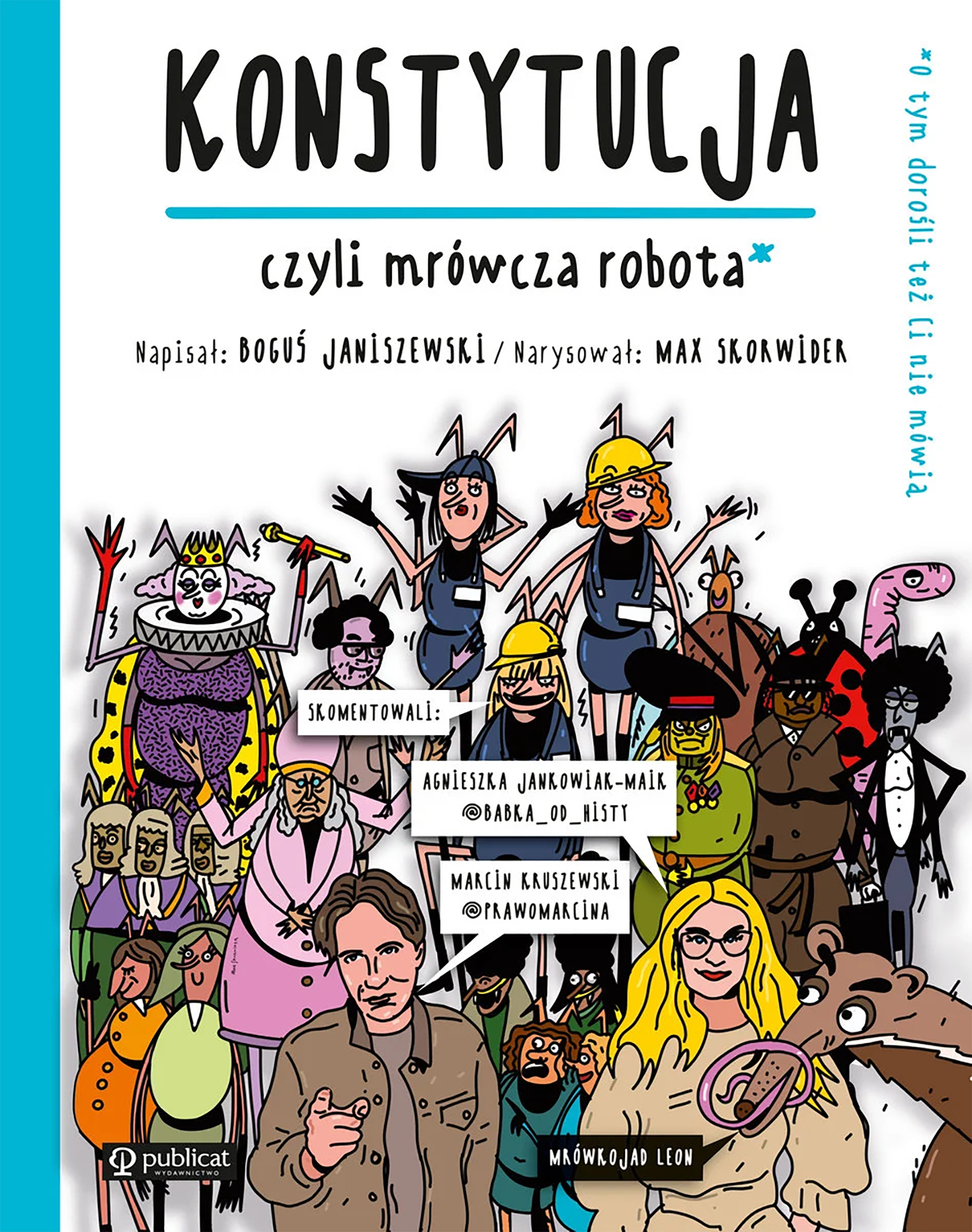 Projekt graficzny książki łączy funkcjonalność z kreatywnym podejściem wizualnym, podkreślając jej edukacyjny charakter. Ilustracje w komiksowej formie, o śmiałej kresce i oszczędnej palecie barw, budują czytelną, dynamiczną narrację wizualno-tekstową. Artysta projektuje ilustracje tak, by współgrały z tekstem i budowały spójną opowieść, tworząc dialog pomiędzy obrazem a słowem. Efektem jest dynamiczne i atrakcyjne plastycznie opracowanie, które pomaga dzieciom (i dorosłym) w przyswajaniu pojęć związanych z demokracją i prawem. Publikacja wydana przez Publicat – jednego z czołowych wydawców literatury edukacyjnej – ukazała się pod patronatem Fundacji Edukacji Prawnej IUSTITIA. Książka była prezentowana na festiwalach i targach, m.in. Komiksowa Warszawa 2025 oraz Międzynarodowych Targach Książki w Warszawie. Recenzje opublikowano w Kulturze Liberalnej i Instytucie Spraw Obywatelskich, a pokaz odbył się również na Zamku Królewskim w Warszawie podczas Święta Konstytucji 3 Maja.